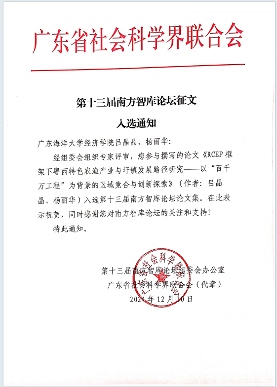 2004年12月9日,以“进一步全面深化改革与推进中国式现代化”为主题的第十三届南方智库论坛在广东省中山市成功举办。此次论坛汇聚了来自全国各地近200名专家学者,他们结合广东实际,为深化改革献计献策。《第十三届南方智库论坛论文集》作为该学术盛事的重要成果展示,收录了众多高质量研究成果,其中包括广东海洋大学437必赢会员中心吕晶晶、杨丽华两位老师的论文 “RCEP框架下粤西特色农渔产业与圩镇发展路径研究——以“百千万工程”为背景的区域竞合与创新探索”。