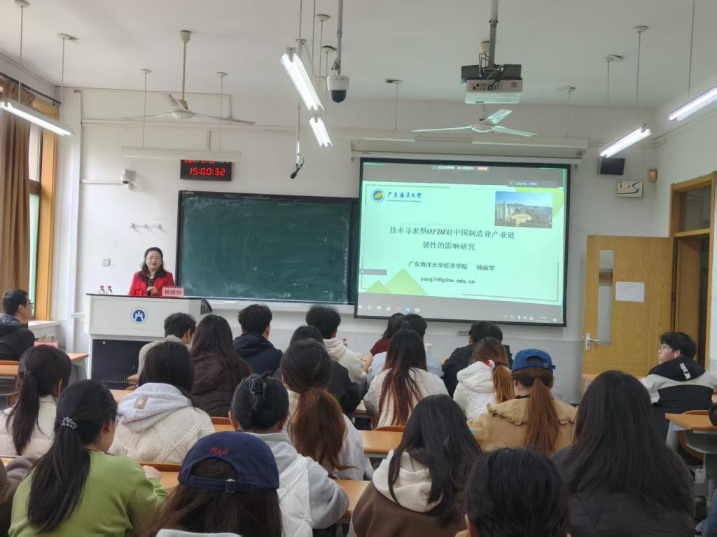 讲座开场,山东财经大学国际经贸学院副院长王舒鸿对杨丽华教授一行的到访表示热烈欢迎,称此次交流为两校学术合作注入新活力。杨丽华教授以《技术寻求型OFDI对中国制造业产业链韧性的影响研究》为题,她结合当前地缘冲突与技术封锁加剧的国际形势,指出技术寻求型OFDI已成为我国突破产业链瓶颈、增强抗风险能力的关键路径。并系统阐释了技术寻求型对外直接投资(OFDI)通过技术进步与要素配置优化提升产业链韧性的核心机制。