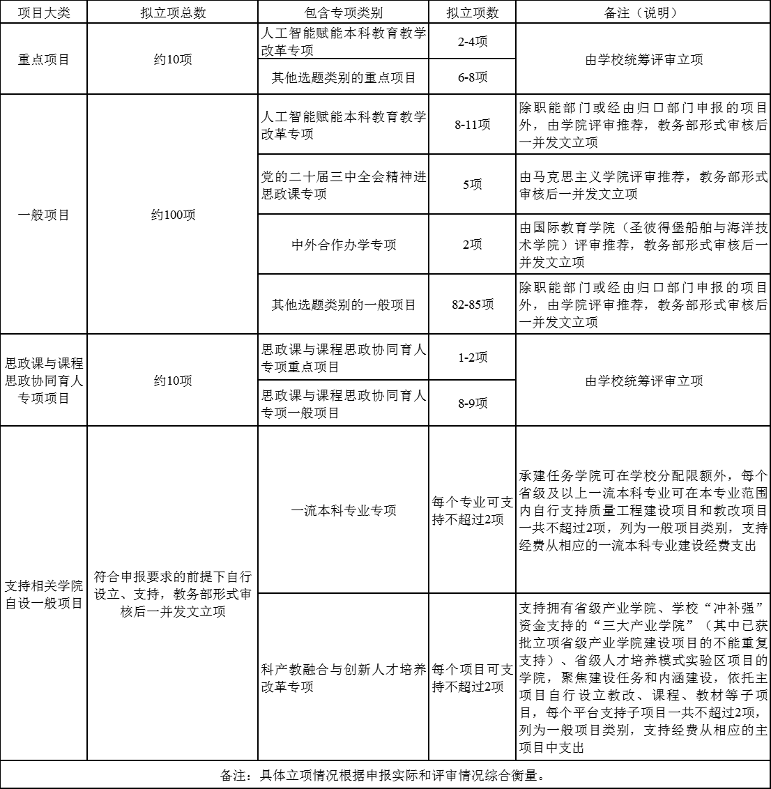 2025年校级教育教学改革项目总体分为重点项目和一般项目两个大类。设思政课与课程思政协同育人、人工智能赋能本科教育教学改革、党的二十届三中全会精神进思政课、中外合作办学、一流本科专业、科产教融合与创新人才培养改革等6类专项项目,及其他选题类别的重点项目、其他选题类别的一般项目。具体如下: