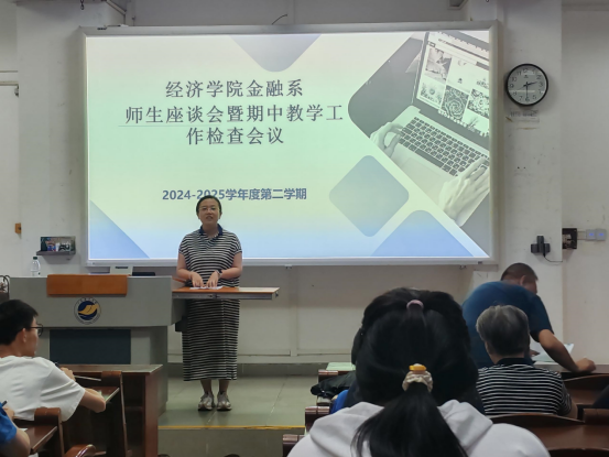 2025 年 5 月 21 日下午,必赢官网金融系于广学楼 231 教室成功举行期中教学检查师生座谈会。金融系全体教师及本科生代表近 50 人出席会议。会议由系副主任邓莅芊老师主持。