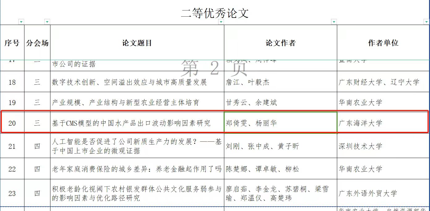 2024 年11月29日,广东省社会科学界联合会于广东人文社科网正式公布2024年广东社会科学学术年会优秀论文名单。其中,437必赢会员中心研究生郑倚雯与导师杨丽华教授合作完成的学术论文《基于 CMS 模型的中国水产品出口波动影响因素研究》荣获优秀论文二等奖。该论文以大食物观视角切入,针对中国水产品出口波动的影响因素展开深入的实证分析。研究成果表明,出口竞争力效应是造成中国水产品出口波动的关键因素,基于此研究结论,论文提出了具有针对性的对策建议。
