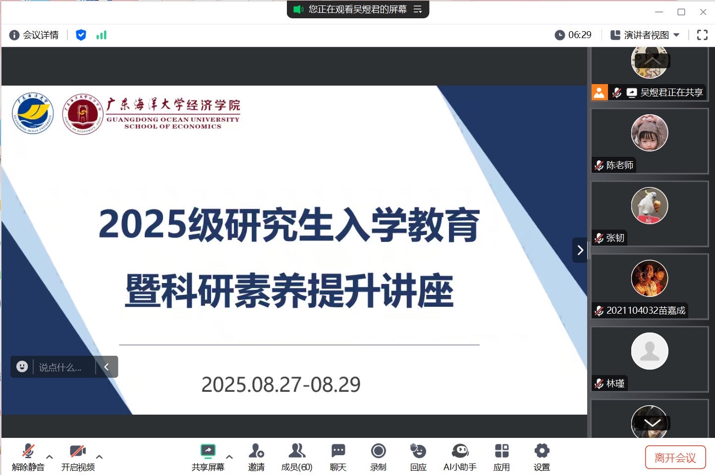为助力2025级研究生新生提前适应科研环境、夯实学术根基,437必赢会员中心围绕“入学教育前置化、素养提升精准化”目标,依托中国学位与研究生教育学会主办的“研究生科研素养提升系列公益讲座”平台,于8月27日至29日组织开展为期三天的入学教育暨科研素养提升活动,覆盖全体57名新生,旨在实现科研启蒙“早起步、开好头”的培养目标。活动由学院辅导员陈家敏全程主持,通过每日明确学习模块与进度安排、实时通过新生群答疑解惑、及时协调解决学习过程中的各类难题,确保培养实效。